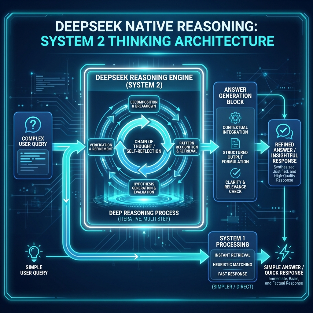 DeepSeek V4 از یک معماری ترکیبی استفاده میکند که کوئریها را به صورت پویا مسیریابی میکند. کوئریهای ساده توسط مسیر کارآمد سیستم ۱ مدیریت میشوند، در حالی که کارهای استدلال پیچیده لایههای سیستم ۲ را فعال میکنند که حلقههای استنتاج تکراری و خود-تاییدی را انجام میدهند.